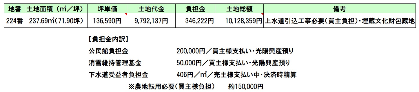 公民館負担金200,000円・消雪維持管理基金50,000円 下水道受益者負担金96,222円 上水道は引込必要です。 |
