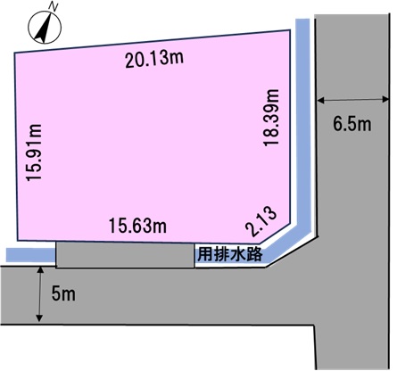 角地 東側 幅員6.5m 接道18.39m 南側 幅員5m 接道15.63m 東南角隅切り 2.13m |